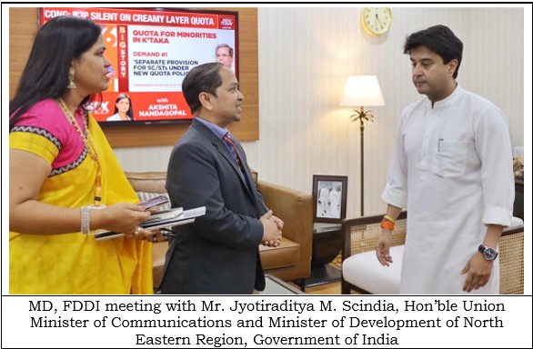 On 20th March 2025, Mr. Vivek Sharma, IRS, MD, FDDI met Mr. Jyotiraditya M. Scindia, Hon’ble Union Minister of Communications and Minister of Development of North Eastern Region, Government of India during which Ms. Manju Maan, ‘Executive Director’ FDDI, Noida and Guna Campus was also present.
