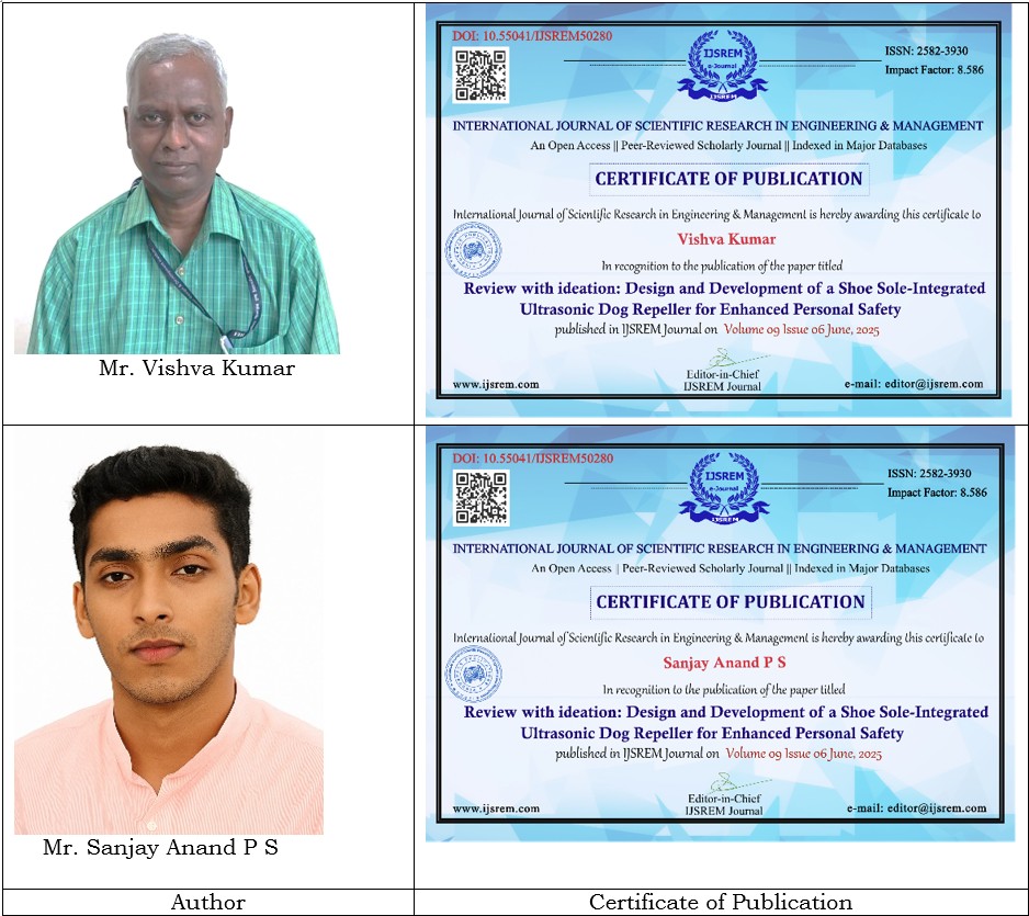 Mr. Vishva Kumar, Senior Faculty Gr-II, School of Footwear Design & Production (FDP) at FDDI, Chennai Campus and Mr. Sanjay Anand P S, an undergraduate student, have co-authored a groundbreaking research paper titled "Review with Ideation: Design and Development of a Shoe Sole-Integrated Ultrasonic Dog Repeller for Enhanced Personal Safety."