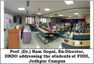 During the orientation programme held on 22nd July 2025 at FDDI, Jodhpur Campus, Prof. (Dr.) Ram Gopal, Ex-Director, DRDO was the Chief Guest. In his address, he encouraged the students to cultivate discipline, emotional intelligence, innovation, and a harmonious outlook toward life.