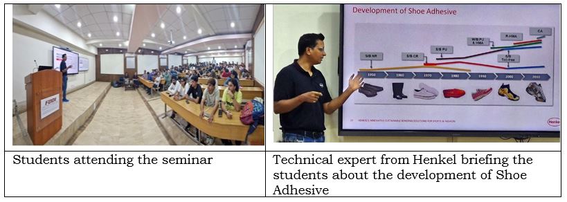 During the seminar, which was organized by the School of Footwear Design and Production (FDP), the technical experts from Henkel namely, Mr. Yogesh Kumar Singh, Application Engineer - APC S&F, and Ms. Priya Parakh, Head Sales - APC S&F, Mr. Anshul Yadav, Sales Engineer - APC S&F briefed the students of M. Des FDP and B. Des FDP about the latest innovations in adhesive technologies.