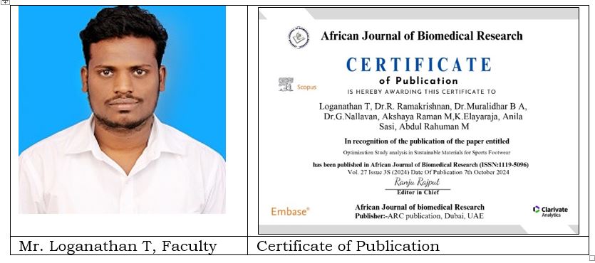 A joint research paper entitled "Optimization Study Analysis in Sustainable Materials for Sports Footwear" of the Faculties of School of Footwear Design & Production (FDP) of FDDI, Hyderabad campus has been published in the African Journal of Biomedical Research, (ISSN 1119-5096).