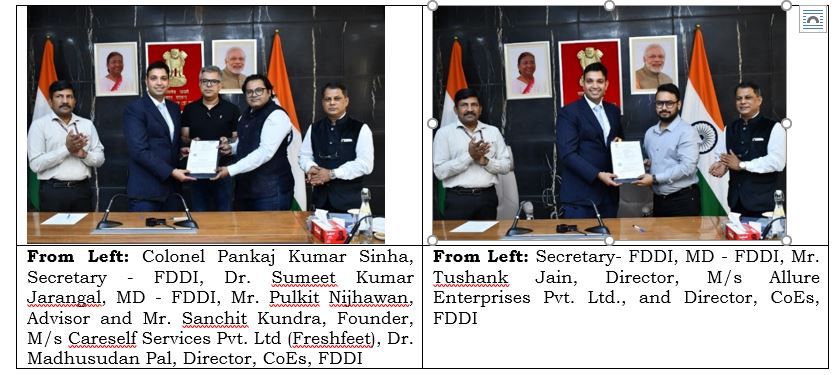 These MoU were signed at Vanijya Bhawan, New Delhi on 09th October 2024 which saw attendance from notable figures in academia and industry, including Colonel Pankaj Kumar Sinha, Secretary - FDDI, Dr. Madhusudan Pal, Director, CoE - FDDI, Dr. Shashi Bala Singh, Advisor, Ms. Priyanka Sharma, Assistant Registrar, Galgotias University; Dr. L. Sujatha, Dean of Rajalakshmi Engineering College; Tushank Jain, Director of Allure Enterprises Pvt. Ltd.; Mr. Sanchit Kundra, Founder, and Pulkit Nijhawan, Advisor of Careself Services Pvt. Ltd. (Fresh Feet).
