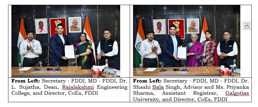 Dr. Sumeet Kumar Jarangal, IAS - Managing Director (MD), FDDI signed the MoUs on behalf of FDDI with the prestigious academia namely, Galgotias University, Uttar Pradesh and Rajalakshmi Engineering College, Chennai and with industry players namely, Allure Enterprises, New Delhi and Careself Services Pvt. Ltd (Fresh Feet), Uttar Pradesh.