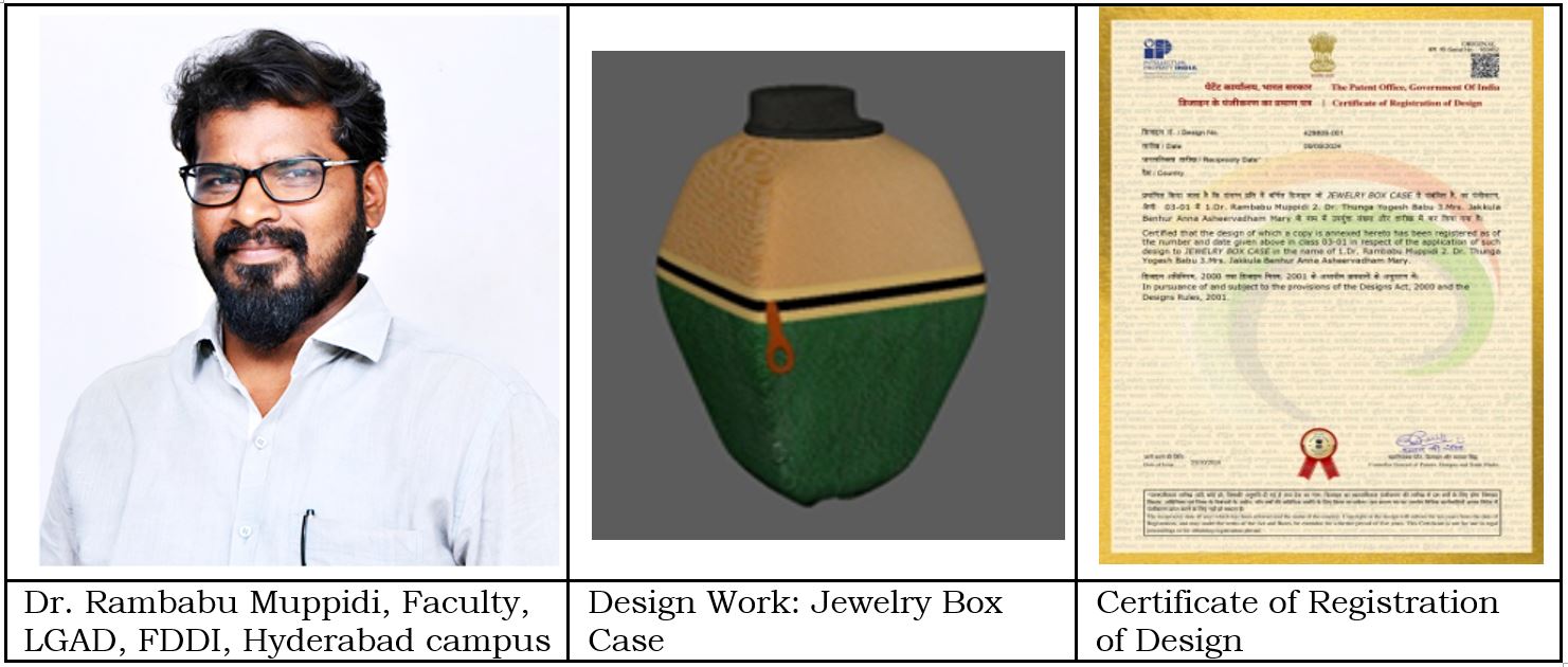 Dr. Rambabu Muppidi, Design Faculty of FDDI School of Leather Goods & Accessories Design (LGAD) of FDDI, Hyderabad campus and two other persons jointly submitted their creative and innovative design title ‘Jewelry Box Case’ to Indian Patent Office, Intellectual Property Building, Kolkata, India for design protection.