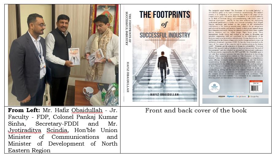 A book titled, ‘The Footprints of Successful Industry’ authored by Mr. Hafiz Obaidullah, Jr. Faculty of the School of Footwear Design and Production (FDP) at FDDI, Noida campus was released by Mr. Jyotiraditya Scindia, Hon’ble Union Minister of Communications and Minister of Development of North Eastern Region, Government of India on 18th November 2024 in the presence of Colonel Pankaj Kumar Sinha, Secretary-FDDI.