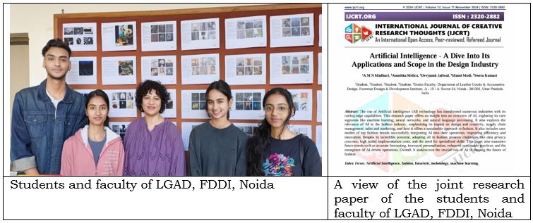 A joint research paper entitled “Artificial Intelligence - A Dive into Its Applications and Scope in the Design Industry", authored by the students of the School of Leather Goods and Accessories Design (LGAD) namely Ms. Madhuri, Ms. Anushka, Mr. Devyansh, and Ms. Mansi, along with their mentor Ms. Sweta Kumari has been published in the International Journal of Creative Research Thoughts (IJCRT).