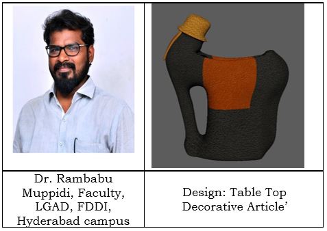 Dr. Rambabu Muppidi, Design Faculty of FDDI School of Leather Goods & Accessories Design (LGAD) of FDDI, Hyderabad campus and two other persons jointly submitted their creative and innovative design of small wooden accessories goods title ‘Table Top Decorative Article’, to Indian Patent Office, Intellectual Property Building, and Kolkata, India for design protection.