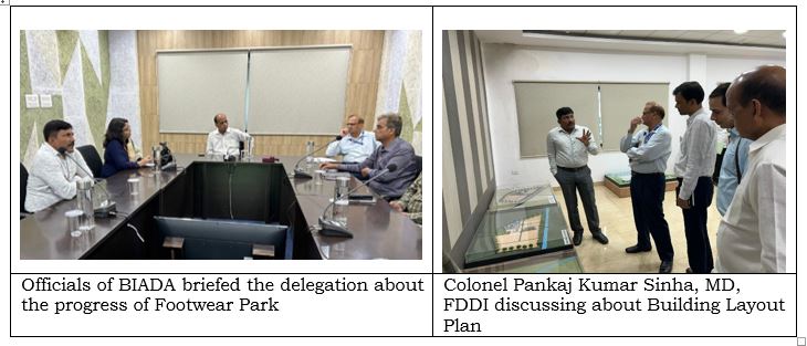 The official of BIADA, namely Mr. Chandra Shekhar Singh, Executive Director - Industrial Development (North), Mr. Santosh Kr. Sinha, Executive Director-Investment Promotion, Mr. Manish Kumar, DGM- Tech. (HQ & North) and Mr. Amit Sinha, DGM- Investment Promotion, briefed the delegation about the progress of upcoming Footwear Park at Mahawal, Muzaffarpur aimed at boosting the footwear and leather industry in Bihar.