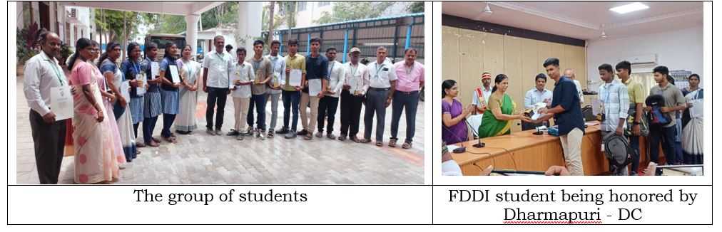 On August 5, 2024, three first-year Bachelor of Design students from FDDI, Chennai campus were honoured by the Dharmapuri - District Collector (DC), Tmt. K. Shanthi, IAS.