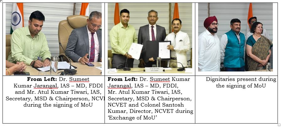 Colonel Santosh Kumar, Director, NCVET signed the MoU on behalf of NCEVT where as Dr. Sumeet Kumar Jarangal, IAS – Managing Director (MD), FDDI signed the MoU on behalf of FDDI in the presence of Mr. Atul Kumar Tiwari, IAS, Secretary, Ministry of Skill Development (MSD) & Chairperson, NCVET.