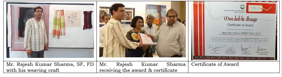 Mr. Rajesh Kumar Sharma, Senior Faculty (SF), School of Fashion Design (FD) of FDDI, Noida campus was felicitated during National Level Exhibition - ‘Mere Desh ke Dhaage’ which was held at Jamia Millia Islamia (JMI) University.