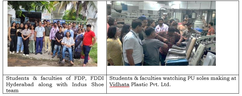On 28th August 2024, under industrial exposure, the students from B.Des FDP 2021, 2022, and 2023 batches of FDDI, Hyderabad campus who were accompanied by faculties of School of Footwear Design & Production (FDP) embarked to two prominent companies: Indus Shoe Industry Safety Footwear and Vidhata Plastics India Pvt. Ltd., gaining valuable insights into the production process and technology.