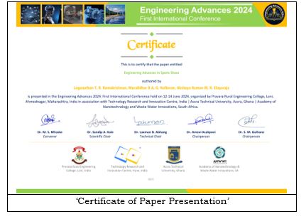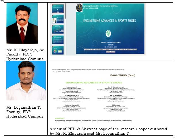 A research paper authored by Mr. K. Elayaraja and Mr. Loganathan T of the School of Footwear Design & Production (FDP) at FDDI's Hyderabad Campus has been presented online at the Engineering Advances 2024: First International Conference held from 12th to 14th June 2024.